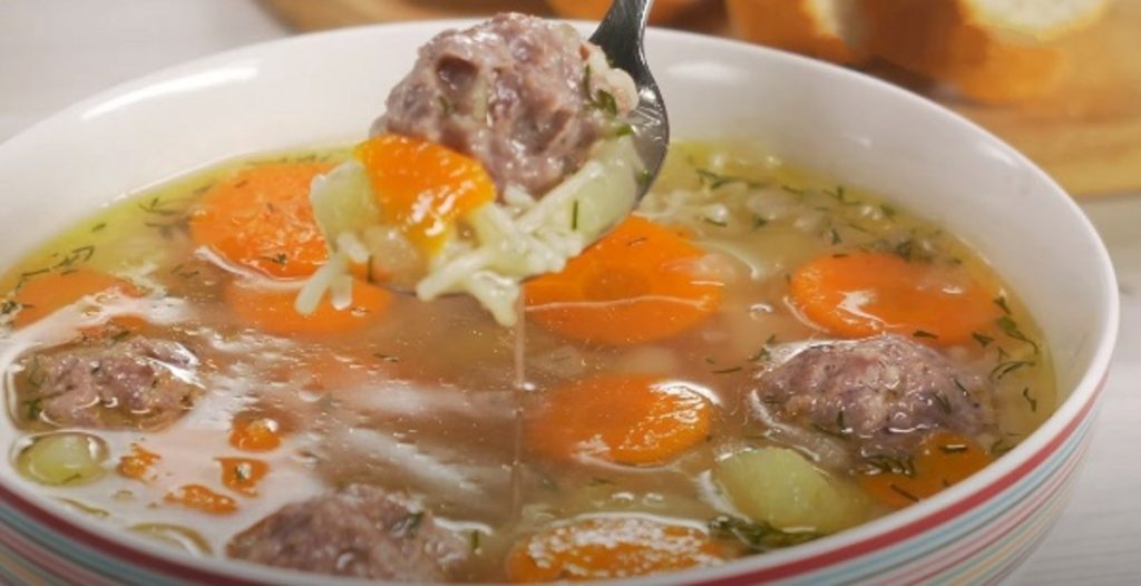 Dodaj posiekaną marchewkę, wymieszaj, przykryj pokrywką i gotuj około 5 minut. Dodaj klopsiki, wymieszaj i gotuj. Dodaj warzywa, sól, czarny pieprz, liść laurowy, wymieszaj, przykryj pokrywką i gotuj jeszcze przez 10 minut na małym ogniu. Posiekaj koperek. Dodaj makaron, zupę gotuj jeszcze przez 3 minuty, dodaj posiekany koperek.
