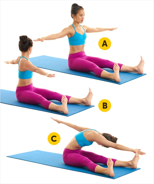 Pamiętajcie o rozciąganiu! Siedząc na macie z wyprostowanymi nogami, które są rozstawione szerzej niż ramiona, wykonujcie obrót ramion o 90 stopni. Następnie, lewą dłonią starajcie się chwycić prawą stopę, powtarzając to 30 razy na stronę. Po zakończeniu, pamiętajcie o wyprostowaniu pleców.