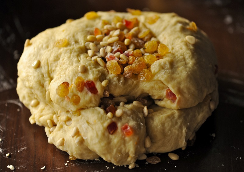 Masło roztop. Mąkę umieść w misce lub na drewnianej stolnicy. Utwórz wgłębienie, w którym umieścisz masło, skórkę z cytryny, cukier, jajka, żółtka, zaczyn. Zagnieć ciasto przez min. 10 min. Ciasto powinno być w miarę gładkie, elastyczne i rozciągliwe. Następnie dodaj rodzynki, owoce i orzechy. Wymieszaj.