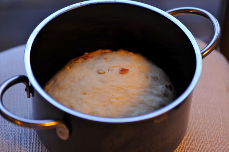Ważne: możesz też dodać inne bakalie lub składniki, na które masz ochotę. Wszystko zależy od Ciebie. Ciasto pozostaw na 1,5 h w ciepłym miejscu do wyrośnięcia. Następnie umieść ciasto w naczyniu do pieczenia (forma, tortownica, naczynie żaroodporne) wyłożonym pergaminem (lub papierem do pieczenia) tak, by wypełniło 1/3 objętości naczynia.