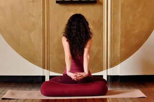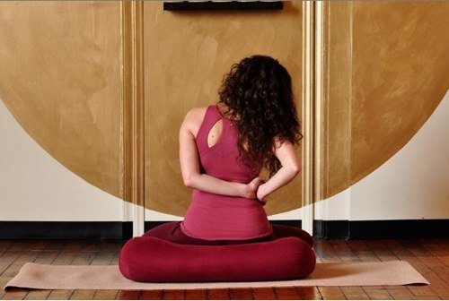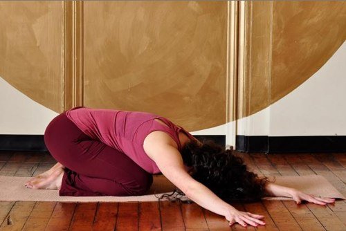 2. Usiądź na piętach, dotknij poduszki kolanami i przytul ją rękoma, jak pokazano na obrazku. Przy 10-20 oddechach trzymaj głowę odwróconą w jedną stronę, a następnie kontynuuj z głową zwróconą w przeciwną stronę.