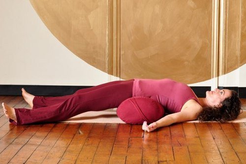 1. Połóż się na plecach, podłóż mniejszą poduszkę lub złożony koc pod łopatki. Trzymaj pięty razem, rozstaw kolana, oddychaj powoli. Trzymaj tę pozycję przez kilka minut.