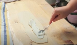 Serek śmietankowy posolić, jeśli nie jest słony i dodać do niego białko, żółtko zachować na później. Z każdej bułki formujemy pasztecik w kształcie wąskiego prostokąta o długości 30 cm, smarujemy serkiem i zwijamy wzdłuż dłuższego boku. Następnie ułóż bułeczki na wysmarowanej olejem blasze, przykryj i pozostaw do wyrośnięcia na 30 minut.