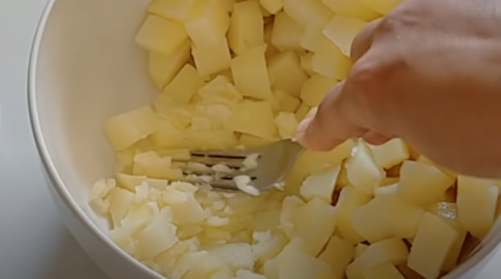 Dodaj pietruszkę i mieszaj, aż powstanie ciasto. Następnie przykrywamy je na 40 minut. Gotowane ziemniaki kroimy w drobną kostkę. Następnie włóż je do miski i rozgnieć widelcem.