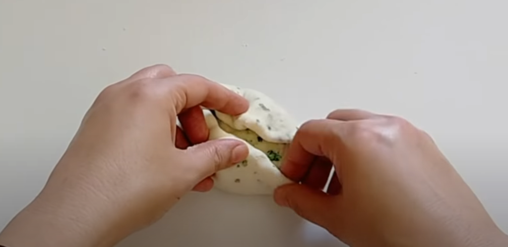 Ciasto wybieramy z miski, kroimy na kilka części, z których robimy kulki. Następnie zwijamy je na rozmiar mniejszego naleśnika, do którego wkładamy kulkę masy ziemniaczanej. Zawijamy kulkę ziemniaczaną w ciasto.