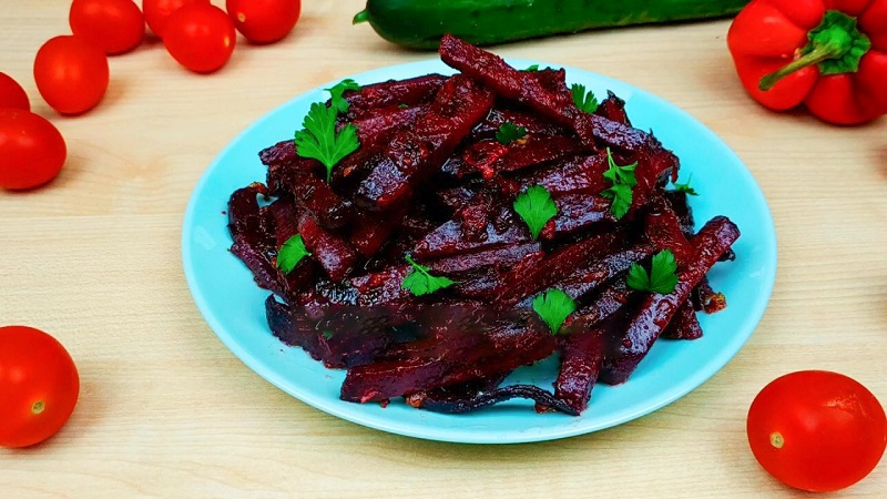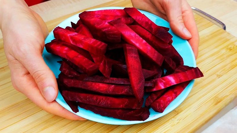 Buraki obieramy ze skórki i dokładnie płuczemy pod bieżącą wodą. Następnie kroimy je w paski tak, jakbyśmy chcieli przyrządzić z nich grubsze frytki.