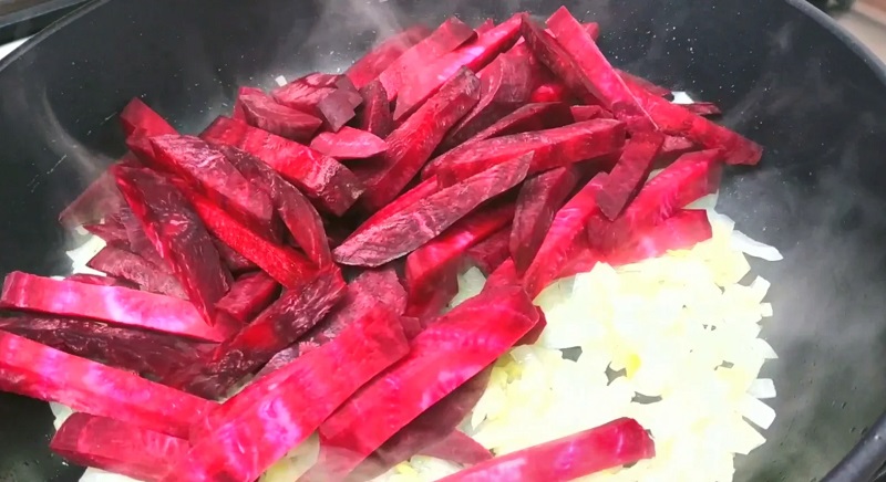Posiekaną drobno cebulę podsmażamy na oleju. Kiedy mocno się zeszkli, dodajemy do niej buraczki. Smażymy przez mniej więcej 10 minut, od czasu do czasu mieszając. Buraki powinny podsmażyć się ze wszystkich stron. Po tym czasie dodajemy posiekany drobno czosnek, śmietanę oraz przyprawy. Garnek przykrywamy pokrywką i dusimy na wolnym ogniu około 20 minut.