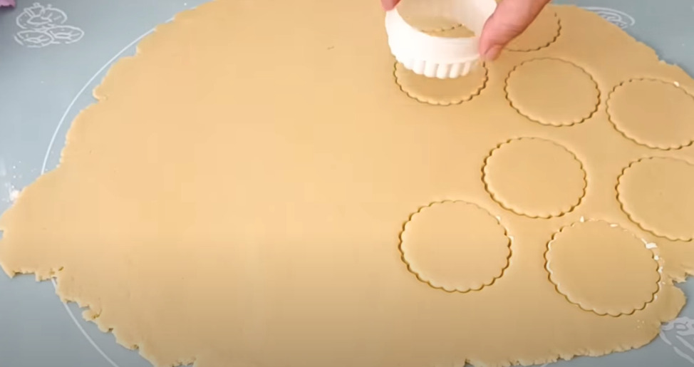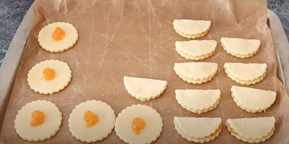 Rozwałkuj ciasto na posypanym mąką blacie na grubość około 0,5 cm. Wycinaj z ciasta krążki lub kwadraty. Na środku każdego krążka umieść łyżeczkę dżemu lub śmietany. Złóż ciastka na pół i delikatnie zlep brzegi. Ułóż ciasteczka na blasze wyłożonej papierem do pieczenia. Piecz w nagrzanym do 180°C piekarniku przez około 15 minut, aż ciasteczka będą złociste.