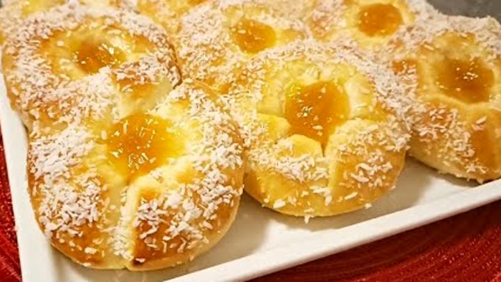 Z puszystego ciasta drożdżowego można upiec ciastka, na środek których wejdzie łyżka marmolady brzoskwiniowej. Po upieczeniu dekorujemy wiórkami kokosowymi.