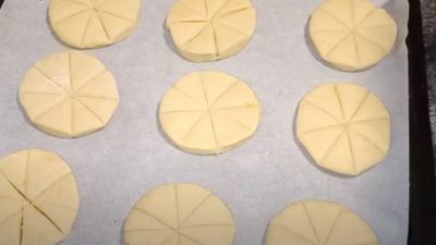 Ciasto przełożyć na oprószony mąką wałek do ciasta i rozwałkować na placek o grubości około pół centymetra. Następnie wytnij z niego koła, których rozmiar zależy od twojego wyboru, ale idealna jest średnica około 8 centymetrów. Następnie wykonaj 4 nacięcia w kształcie gwiazdek w każdym kółku, ułóż je na blasze wyłożonej papierem do pieczenia i odstaw do wyrośnięcia pod przykryciem na 15 minut.