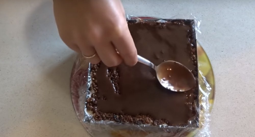 Kiedy polewa lekko ostygnie, polej wierzch ciasta. Odczekaj kilkadziesiąt minut. Ciasto bez pieczenia jest gotowe!