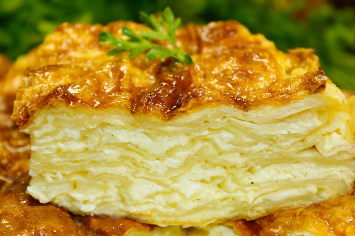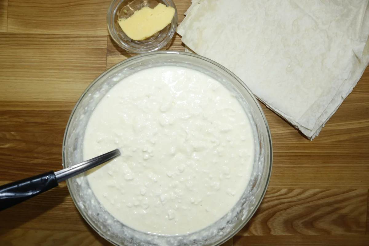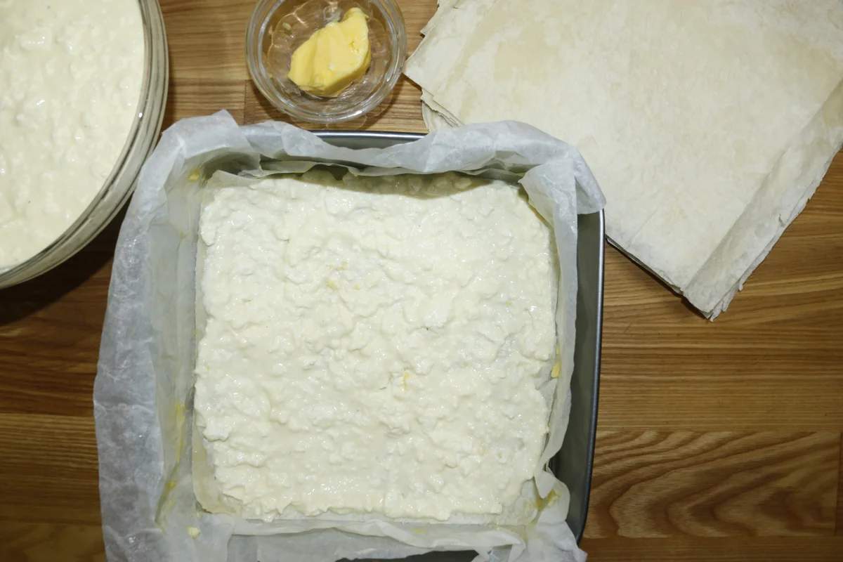 Ciasto ma różne kształty. Niektórzy smarują arkusze ciasta nadzieniem, po czym zwijają w rolki i rozprowadzają w okrągły kształt w formie spirali. Te same rolki można po prostu ułożyć obok siebie. Wybrałam najbardziej leniwą wersję bułgarskiej banitsy – arkusze złożyłam w stos i posmarowałam twarogiem.