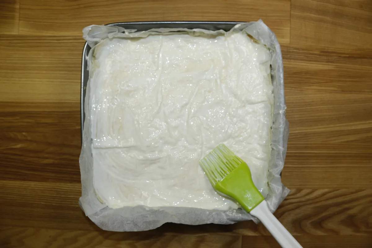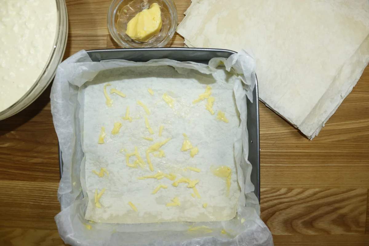 Połóż jeden arkusz na dnie wysmarowanej tłuszczem formy do pieczenia i posmaruj ją masłem.