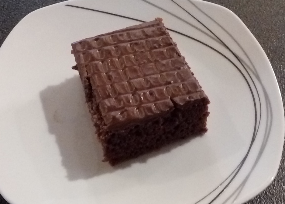 Dodaj mleko i olej, wymieszaj. Do ciasta dodajemy również startą czekoladę, kakao i przesianą mąkę. Wszystko dobrze miksujemy . Ciasto wylewamy na blachę wyłożoną papierem do pieczenia.