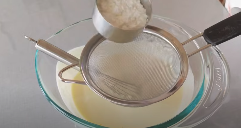 Do dużej miski dodaj 2 szklanki jogurtu greckiego. Jeśli lubisz słodsze ciasto, możesz dodać trochę cukru lub słodzika. Dodaj 4 jajka, jedno po drugim, ubijając za każdym razem, aż jajka całkowicie połączą się z jogurtem. Przesiej 4 łyżki mąki kukurydzianej do mieszanki jajeczno-jogurtowej. Dobrze wymieszaj, aż nie pozostaną żadne grudki skrobi kukurydzianej.