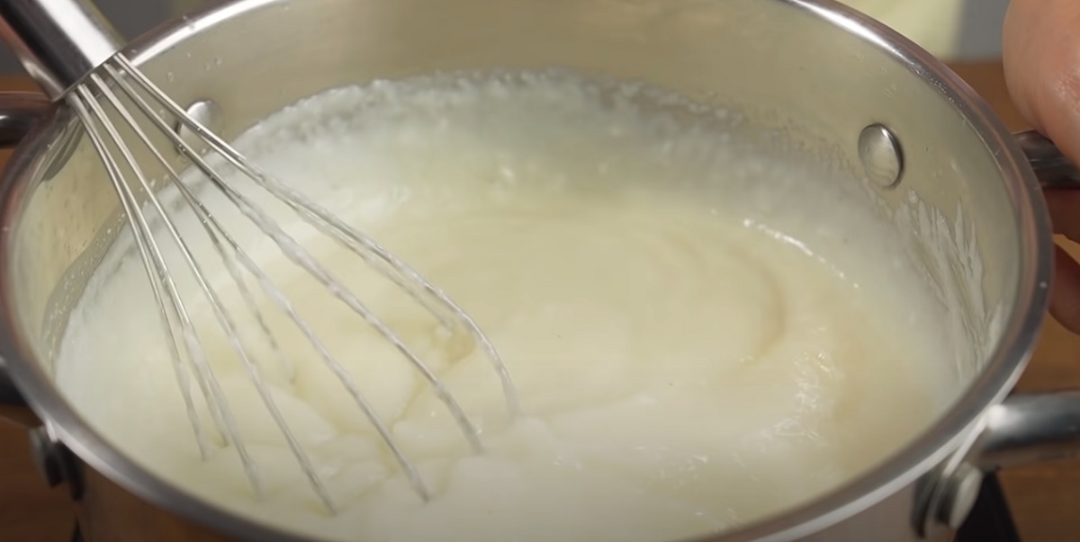 Dokładnie wymieszaj. Przygotowaną mieszankę gotuj przez jedną minutę na małym ogniu, cyklicznie mieszając. Ściągnij z garnek z ognia. Do garnka z mlekiem dodaj miękkie masło i dokładnie wymieszaj.