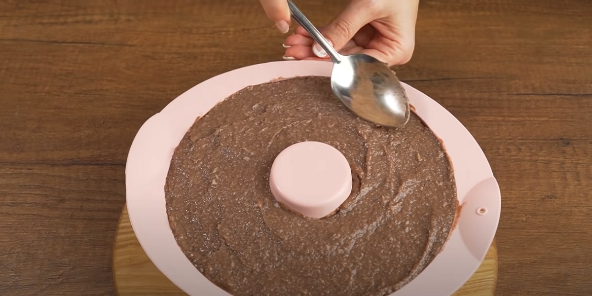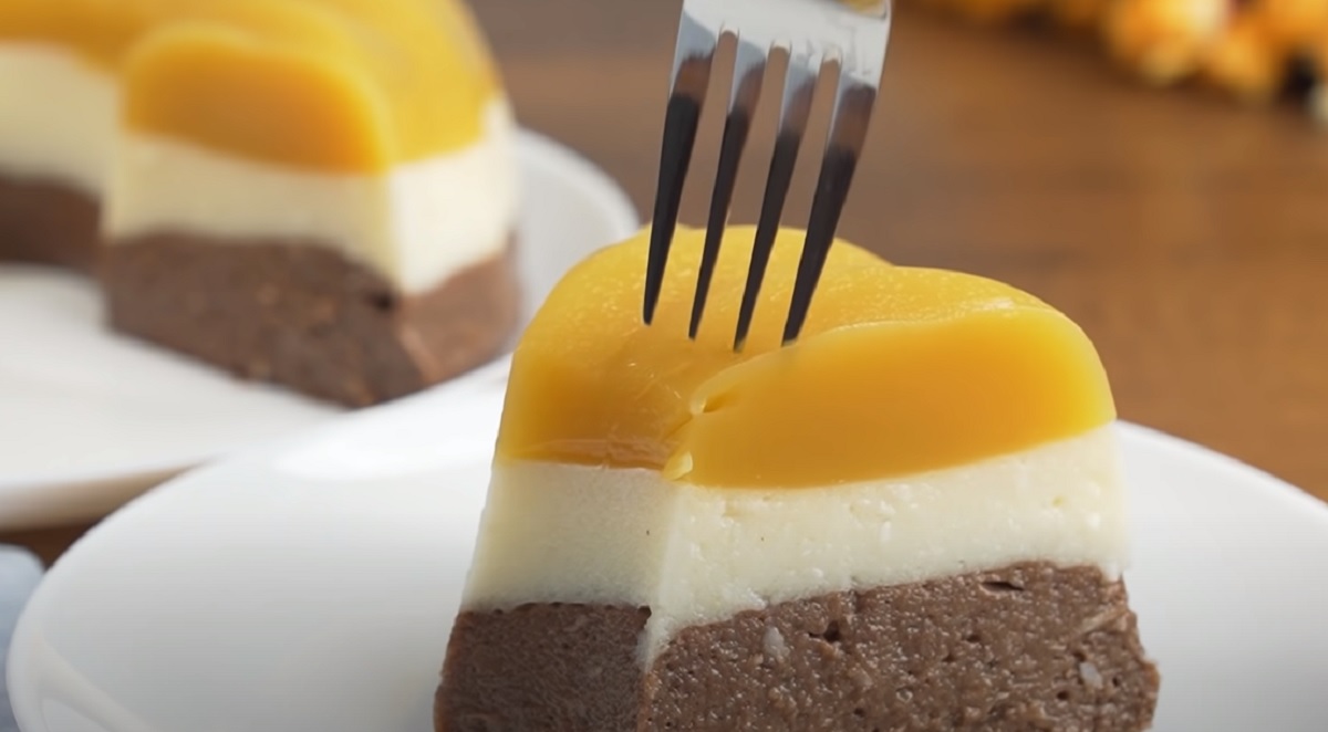 Połowę tej przygotowanej masy przełóż do formy z masą pomarańczową i równomiernie rozprowadź. Do drugiej połowy dodaj kakao i dobrze wymieszaj. Delikatnie rozprowadź kakaową masę na masie kokosowej. Poczekaj, aż ciasto osiągnie temperaturę pokojową, a następnie przykryj folią spożywczą.