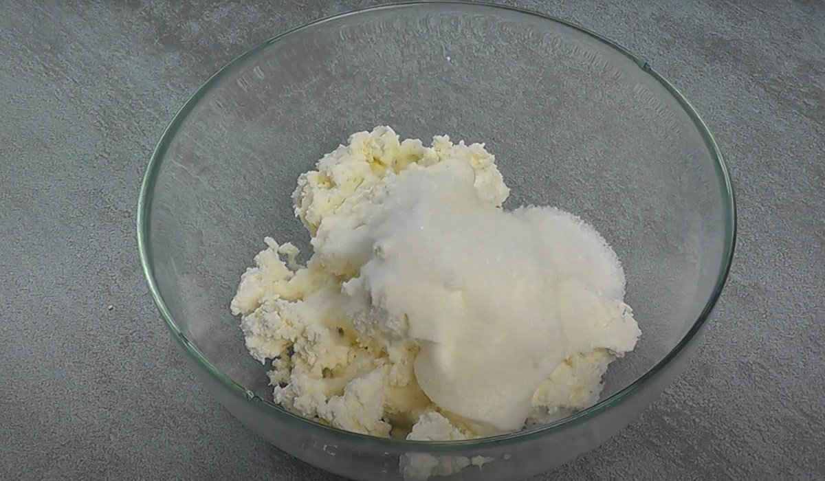 Teraz przygotuj nadzienie: rozgnieć twarożek ze śmietaną i cukrem. Możesz użyć w tym celu również blendera.