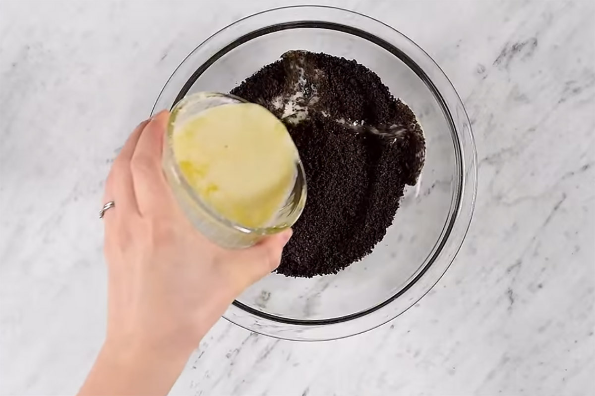 Zacznij od rozdrobnienia ciastek, możesz w tym celu posłużyć się blenderem. Następnie rozpuść masło i w jednej misce wymieszaj je ze zmielonymi herbatnikami.