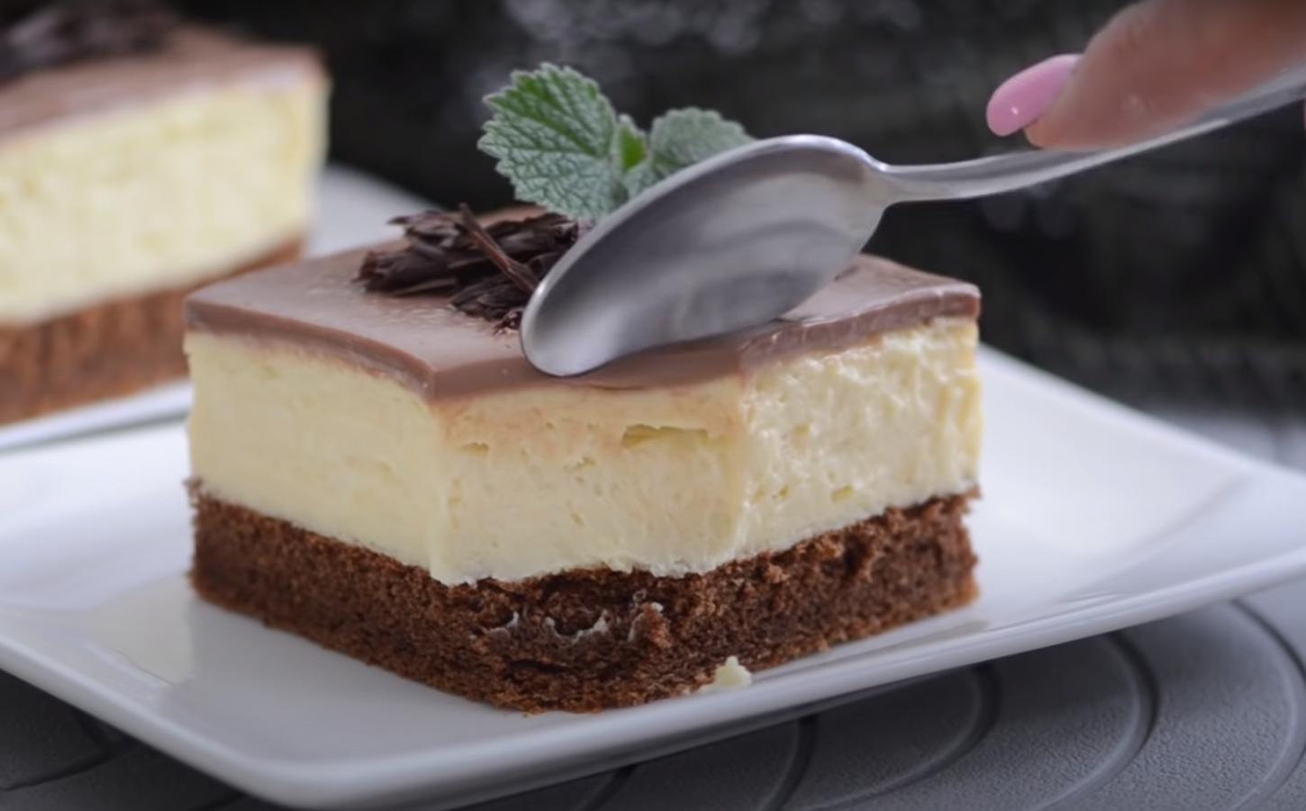 Wcześniej przygotowany krem ubij za pomocą miksera z masłem. Wyłóż masę na upieczony biszkopt. Przygotuj polewę, rozpuszczając czekoladę w gorącej śmietanie. Tak przygotowaną polewą pokryj całe ciasto. Wstaw je do lodówki, aby wszystkie warstwy się ze sobą połączyły.