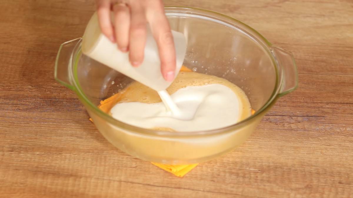 Ubij jajko z 1 łyżką cukru i szczyptą soli. Wlej kefir i olej słonecznikowy, dodaj sodę oczyszczoną (lub 1 łyżeczkę proszku do pieczenia) i 1-1,5 łyżeczki cukru waniliowego.