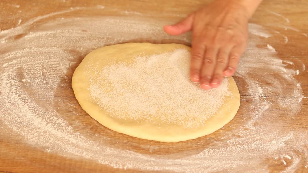 Ułóż ciasto na posypanej mąką stolnicy. Rozwałkuj ją w prostokątną lub okrągłą warstwę o grubości 1 cm i posyp cukrem i cukrem waniliowym.