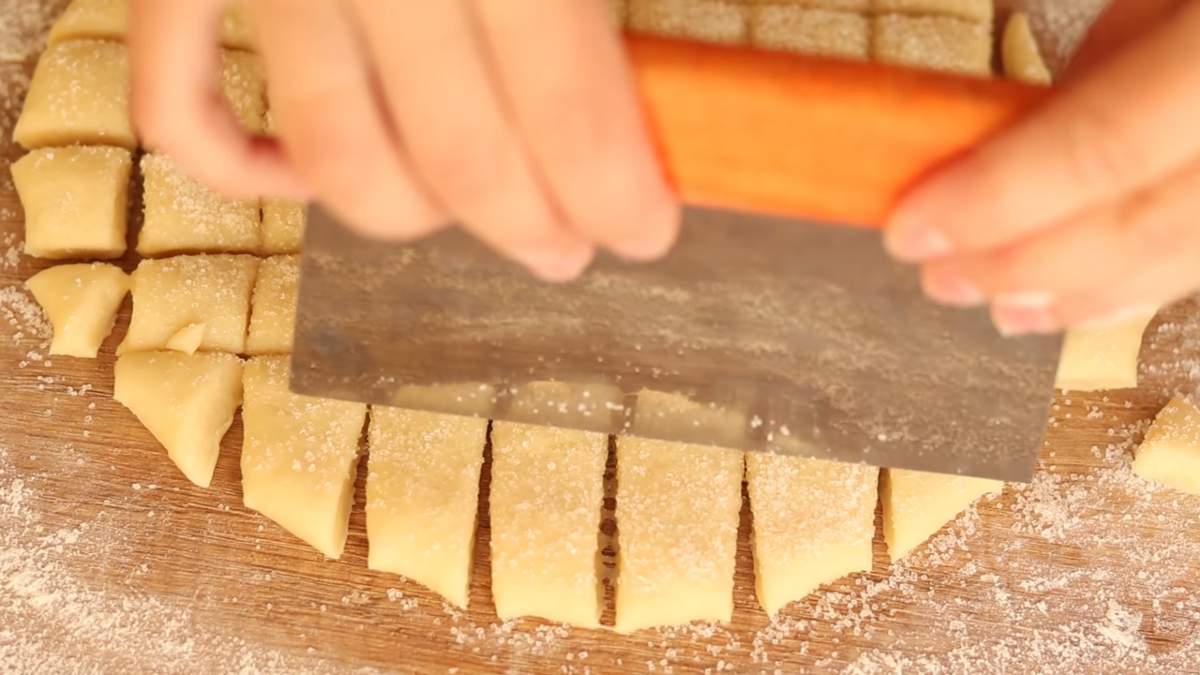 Ponownie rozwałkuj ciasto wałkiem do ciasta, aby lekko wcisnąć do niego cukier. Warstwę pociąć na kwadraty o długości boku 2 cm.