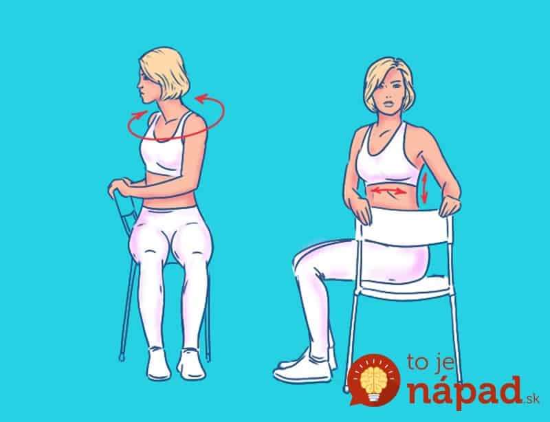 Rozpocznij to ćwiczenie siedząc bokiem do oparcia krzesła. Upewnij się, że stopy są stabilnie oparte na podłodze, a nie wiszą w powietrzu. Najpierw ściągnij łopatki, prostując plecy, a następnie obróć ramiona na bok, skieruj lewą stroną twarzy w kierunku oparcia krzesła i oprzyj dłonie na oparciu. Pamiętaj, aby tylko ramiona się poruszały, reszta ciała powinna pozostać nieruchoma! Pozostań w tej pozycji przez 30 sekund, oddychając głęboko. Powtórz ćwiczenie na drugą stronę. Wykonaj trzy serie dla każdej strony.
