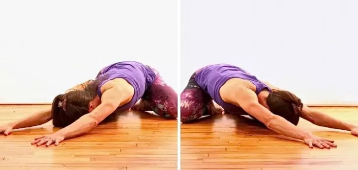 Następnie przesuwaj dłonie po podłodze w prawo, tak daleko, jak to możliwe, aby dokładnie poczuć rozciąganie po lewej stronie ciała. Wykonaj kilka głębokich, spokojnych oddechów. Następnie powtórz ćwiczenie, zmieniając stronę. Jeśli odczuwasz ból w kolanach podczas tego ćwiczenia, umieść pod nimi płaską poduszkę.