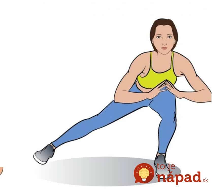 Stań z nogami lekko ugiętymi w kolanach, dłonie złącz w okolicy brody. Wykonując kroki na szerokość ramion, zawsze zaczynaj od strony prawej, potem wracaj do wyjściowej i idź w lewą stronę. Staraj się nie poruszać rękami, a ciało utrzymuj lekko pochylone do przodu. Wykonaj to ćwiczenie 10 razy w każdą stronę.