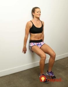 Oprzyj plecy o ścianę, stojąc w odległości 60 cm od niej. Poruszaj się w dół do momentu, gdy kolana będą pod kątem 90 stopni, opierając się plecami o ścianę. Przytrzymaj pozycję przez 30 do 60 sekund i powtórz 2-3 razy.
