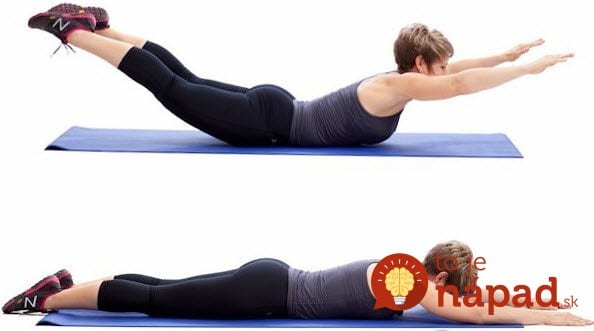 To ćwiczenie jest bardzo podobne do pływania na sucho, tylko podnosisz jednocześnie obie ręce i nogi. Wykonaj 15 powtórzeń.