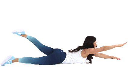 Leżąc twarzą do dołu, umieść ręce przed sobą. Naprzemiennie podnoś lewą rękę i prawą nogę, a potem prawą rękę i lewą nogę. Nie zapomnij o prawidłowym oddychaniu. Powtórz 30 razy, po 15 razy dla każdej strony.