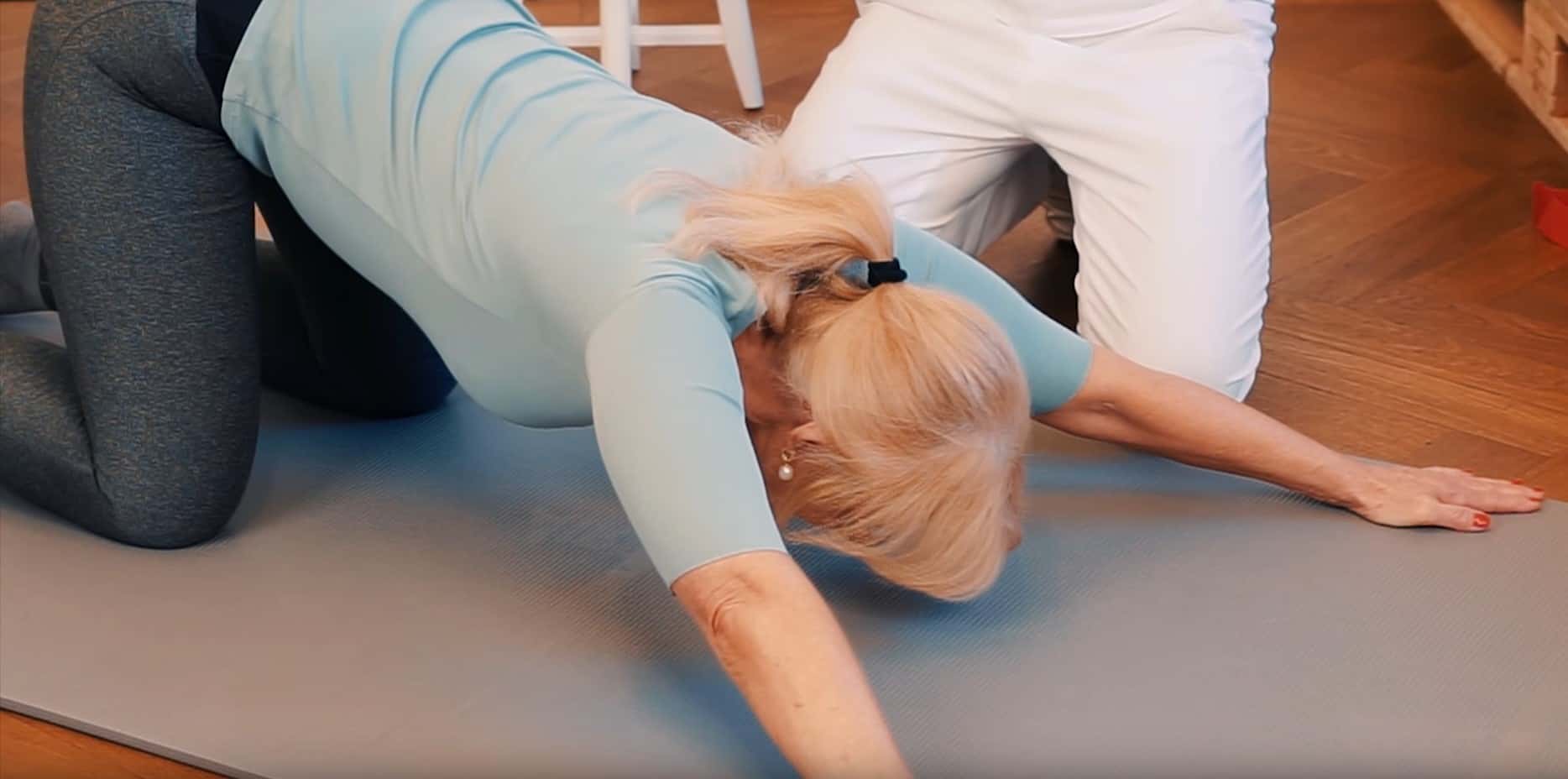 - Koci grzbiet – Rozgrzewa kark, ramiona i kręgosłup. Z pozycji na czworakach, powoli zaokrągl plecy, a następnie delikatnie je wygięj, powtarzając ruch 10 razy.