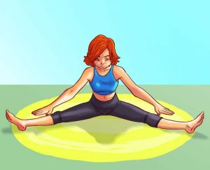 W celu wykonania tego ćwiczenia trzeba usiąść z wyciągniętymi plecami, a także rozstawić nogi możliwie najdalej od siebie. Należy pamiętać, aby w trakcie wdechu podnieść ręce do góry. Z kolei podczas wydechu zadaniem kobiety będzie pochylenie się najbardziej, jak to możliwe.