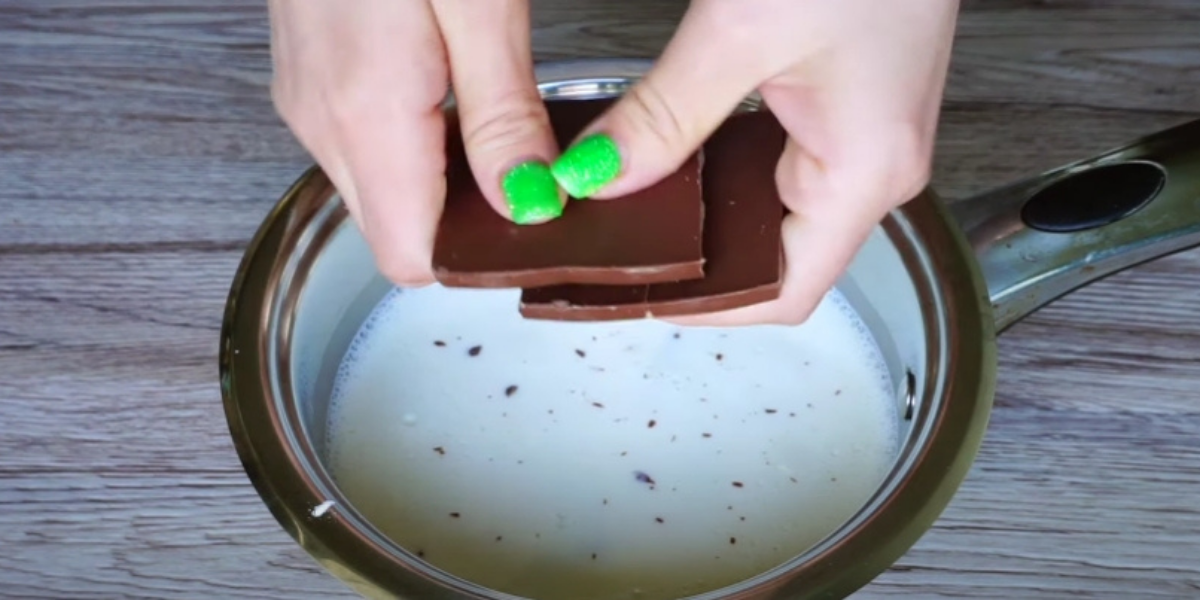 Dodaj 2 połamane czekoladki i włóż do ognia. Mieszaj ciągle na średnim ogniu.
