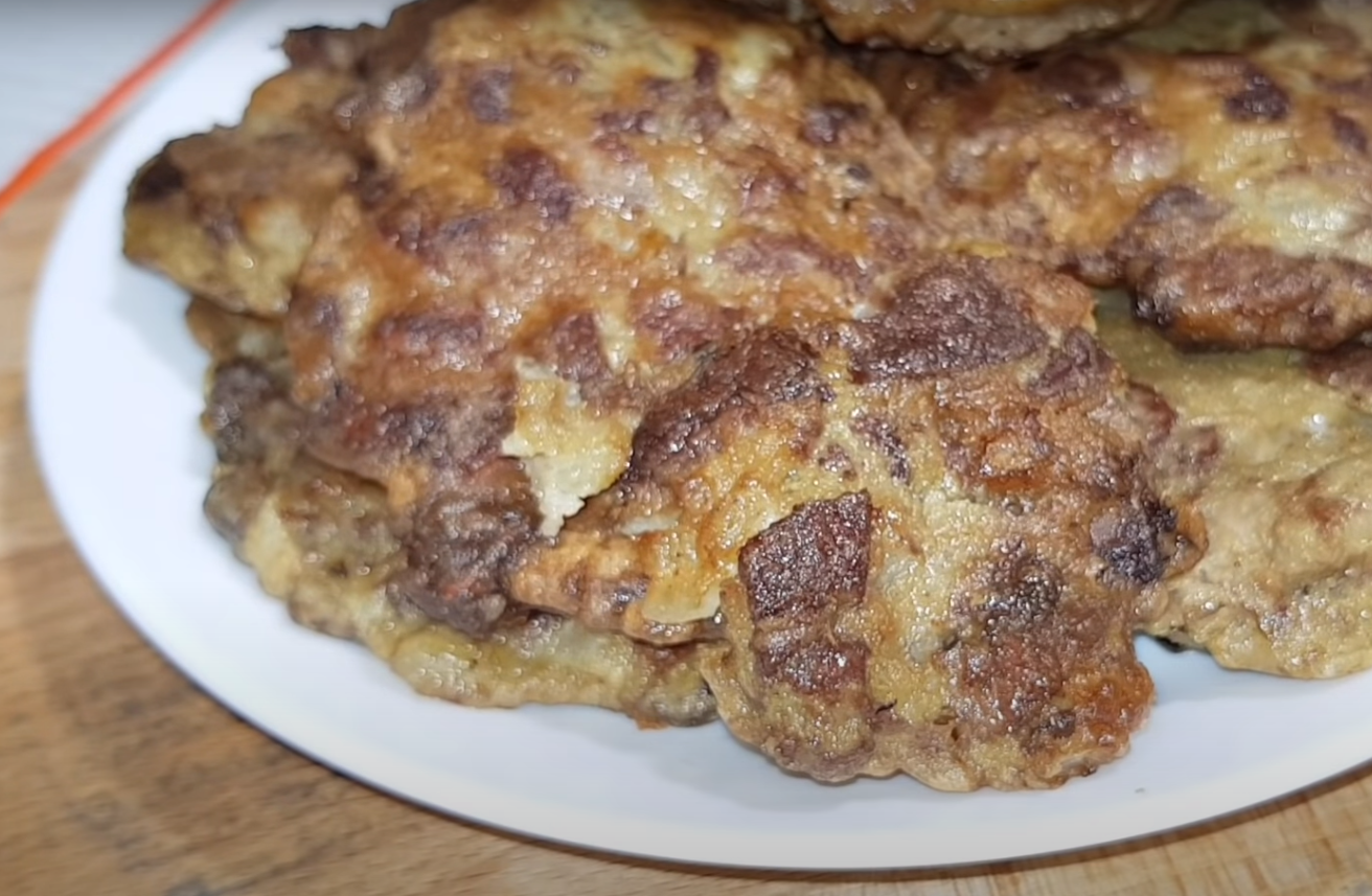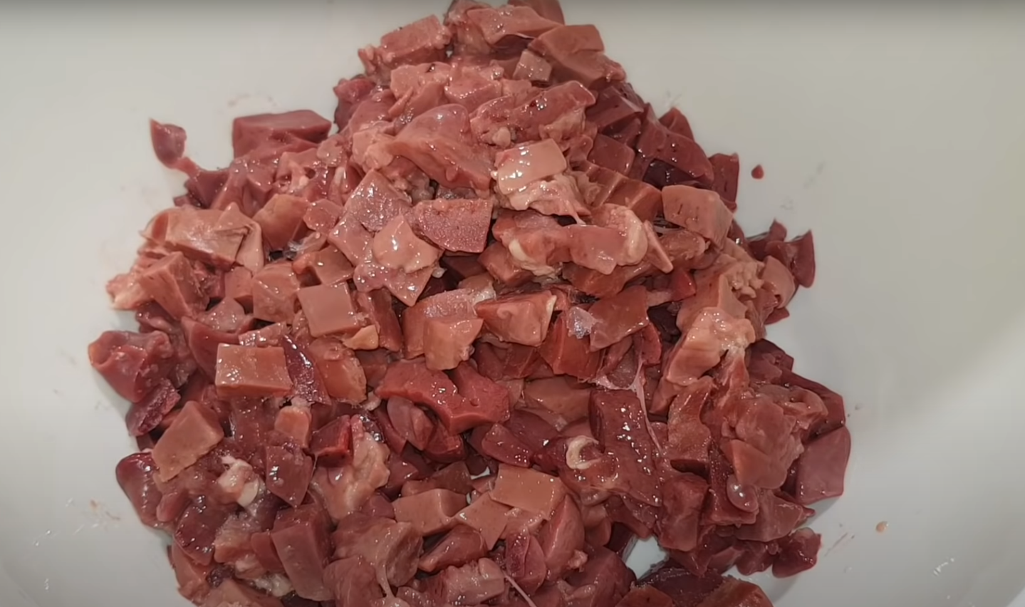 Do głębokiej miski wbij dwa jajka, dodaj dwie łyżki majonezu i taką samą ilość mąki, wymieszaj. Otrzymasz dość płynne ciasto. Drobno posiekaj jedną cebulę, podsmaż ją na niewielkiej ilości oleju i dodaj do ciasta. Czosnek przeciśnięty przez praskę i posiekane zioła również dodaj do mieszanki. Przypraw słodką papryką i solą do smaku, wymieszaj. Pokrój wątróbkę na kawałki wielkości około 3 x 3 cm i włóż je do ciasta.