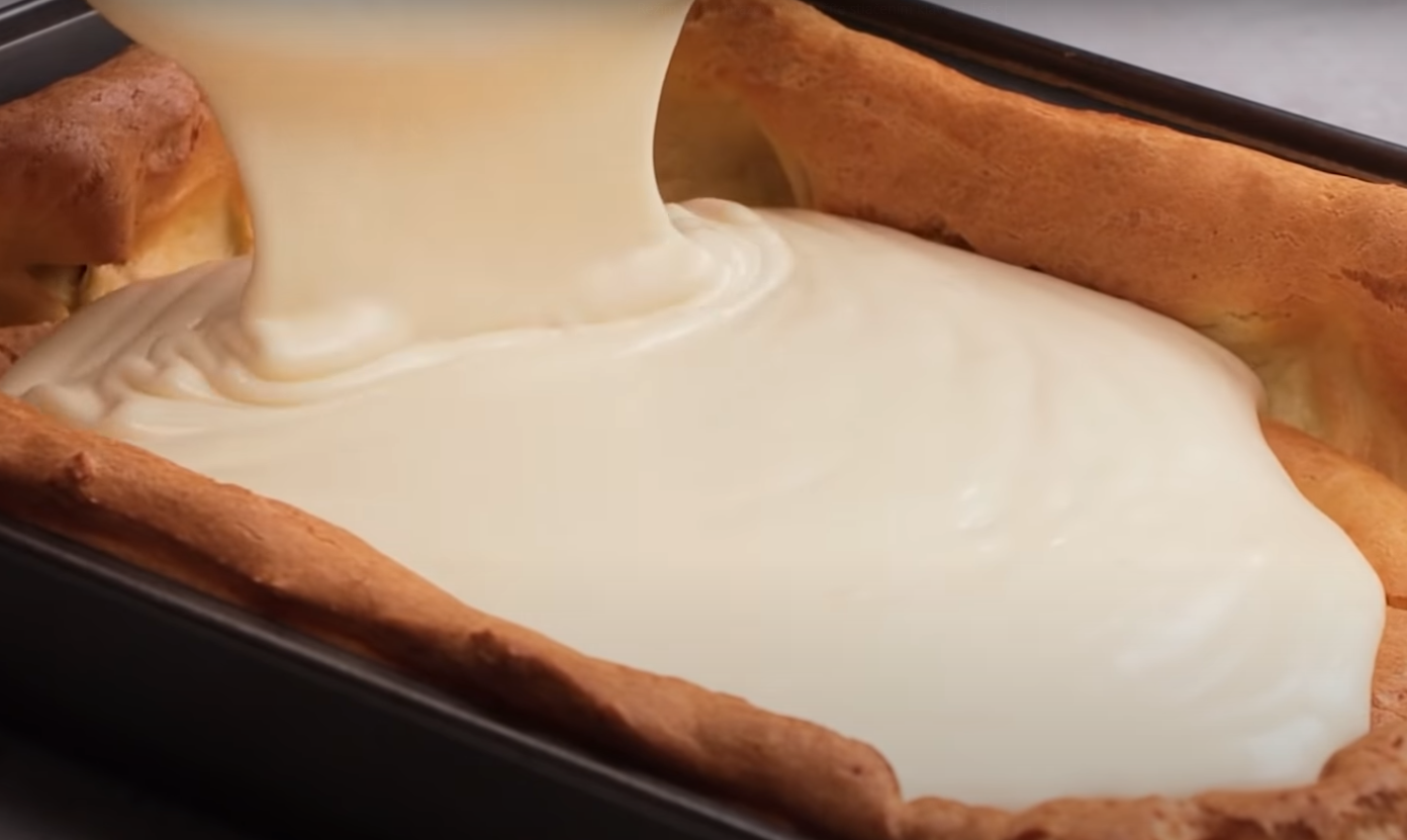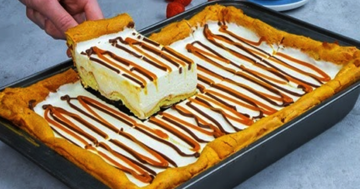 Ubij kremówkę na sztywno. Stopniowo dodawaj ją do kremu budyniowego, delikatnie mieszając. Wylej gotową masę na upieczone ciasto, wyrównaj.