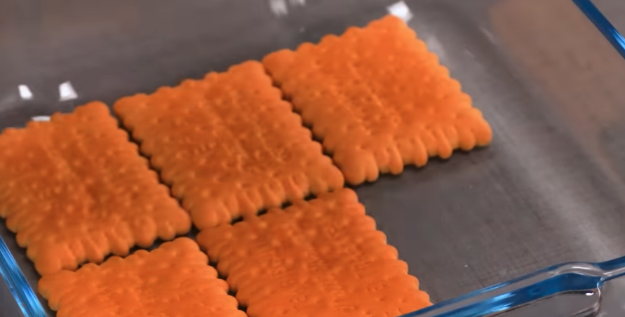 - Herbatniki pokrusz i wyłóż nimi spód blachy o wymiarach 16 cm x 16 cm.