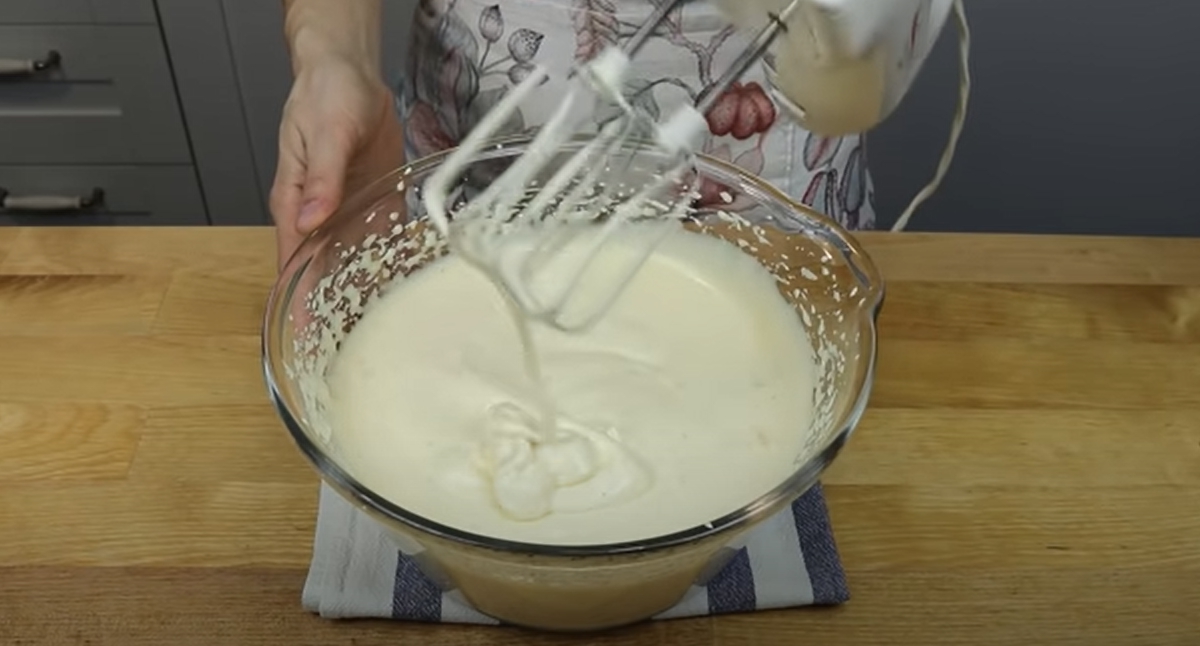 Najpierw przygotuj biszkopt. Rób to ubijając mikserem jajka z cukrem. Czynność ta powinna trwać około dziesięciu minut przy ustawionym na najwyższe obroty sprzęcie.