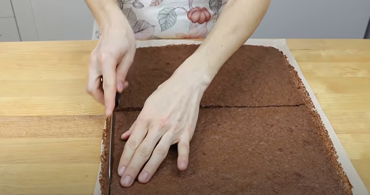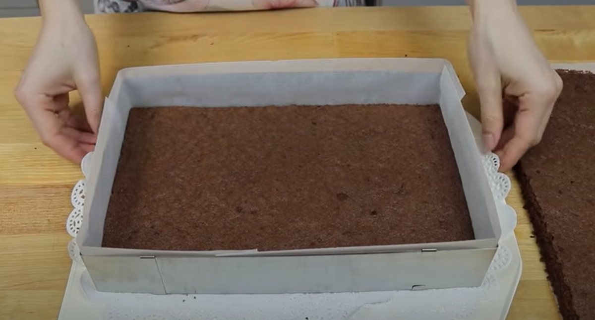 Jeżeli krawędzie tego wymagają, obetnij je aby były równe. W formie o kształcie kwadratu umieść połowę biszkopta i przykryj ją papierem do pieczenia bądź folią.