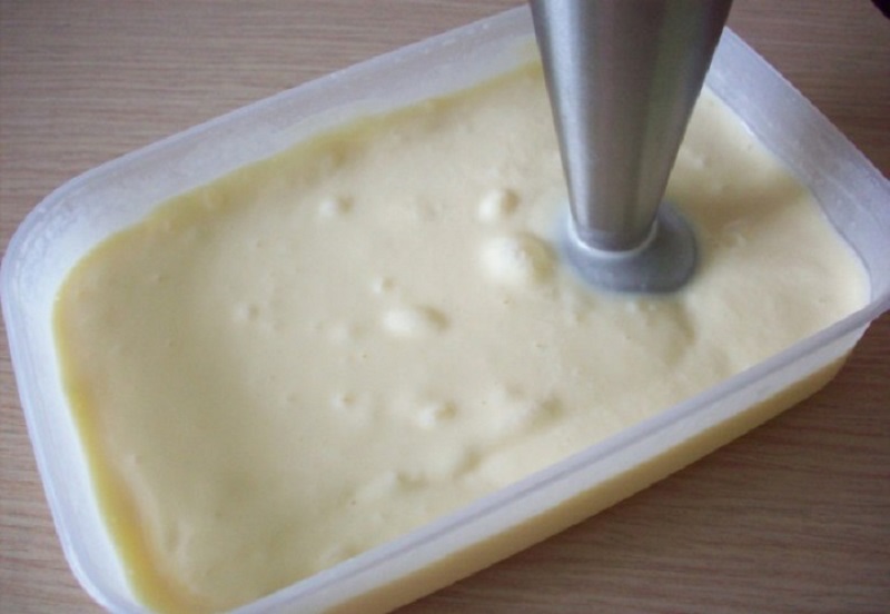 Śmietanę kremówkę ubić w osobnym garnku na sztywną masę. Obie masy dokładnie wymieszać ze sobą i umieścić je przygotowane w zamrażarce. Co godzinę należy wyjąć pojemnik i przemieszać masę. Dzięki temu będzie ona bardziej puszysta i bez żadnych grudek.