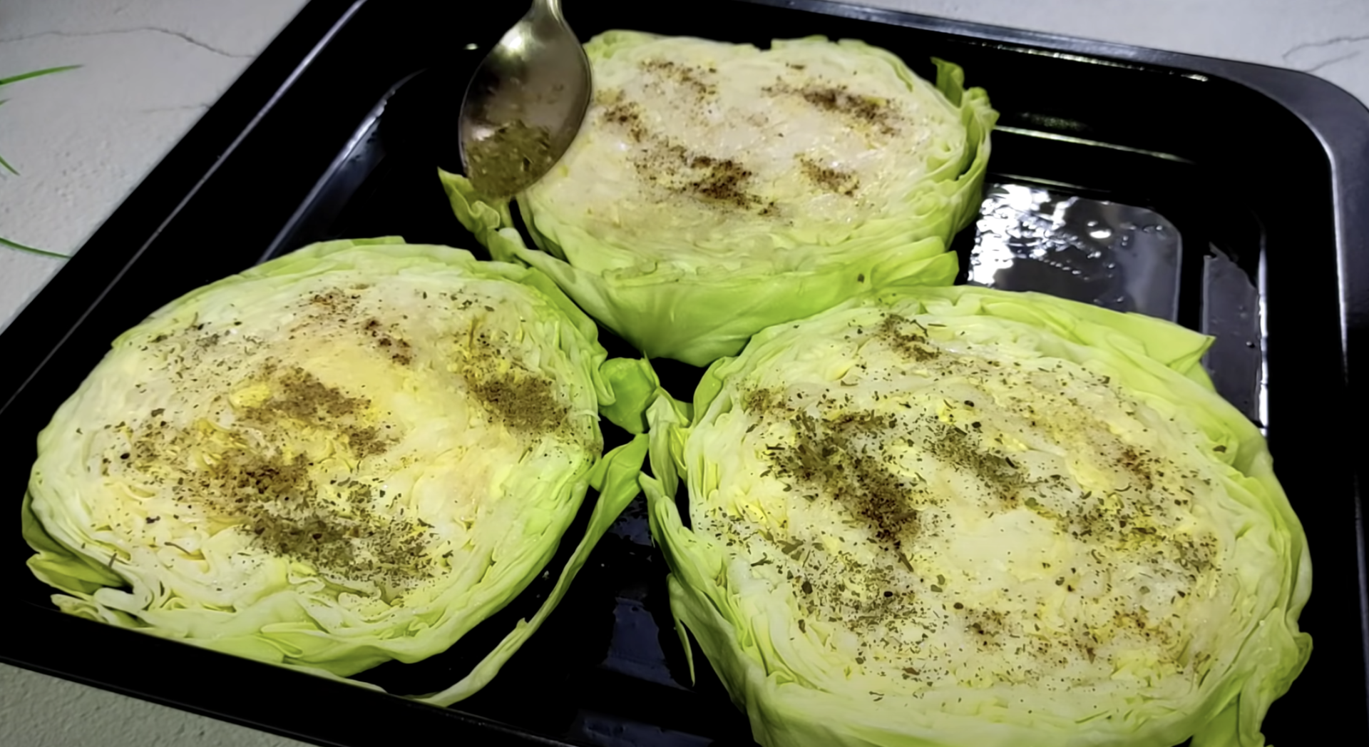 Przede wszystkim kapustę kroimy na plastry mające grubość około 2 centymetrów i kładziemy na blasze, którą wcześniej posmarujemy tłuszczem.