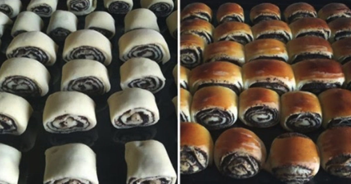 Po odsączeniu maku od wody, blendujemy go z chałwą i mieszamy do uzyskania jednolitej masy. Przygotowane wcześniej ciasto, dzielimy na mniej więcej równe części. Następnie każdą z nich rozwałkowujemy do owalnego kształtu, a następnie smarujemy nadzieniem.