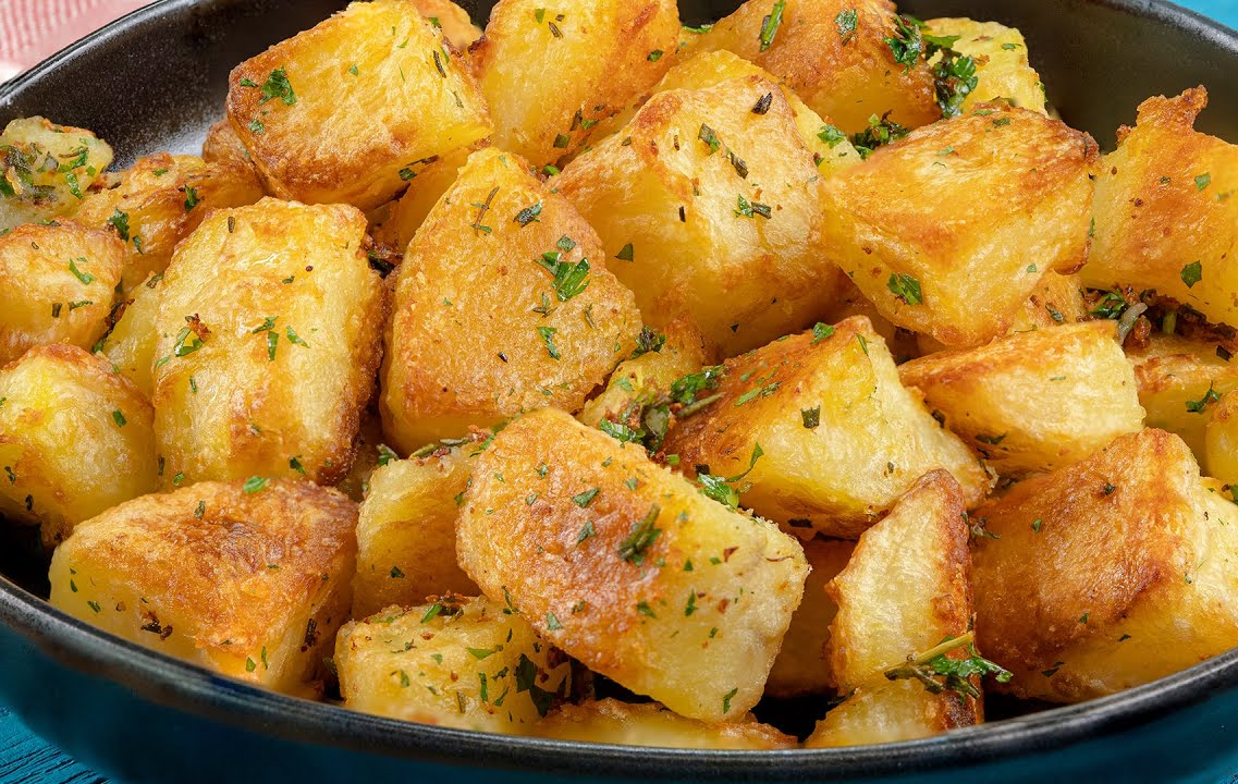 Podczas pieczenia przemieszaj ziemniaki, aby były chrupiące ze wszystkich stron. Dopraw rozmarynem i czosnkiem, dodaj posiekaną natkę pietruszki.