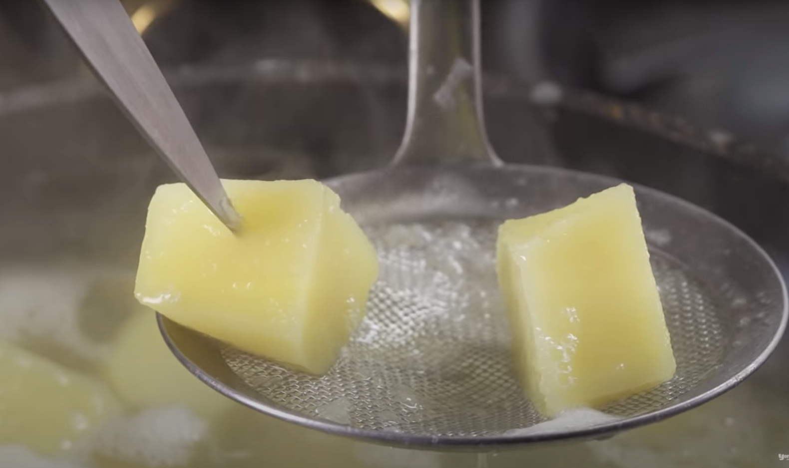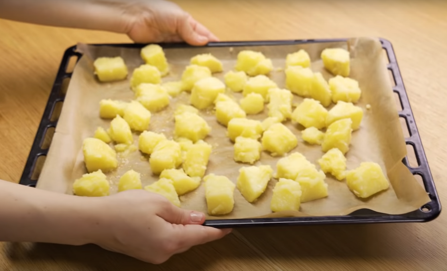 Obierz ziemniaki i pokrój w kostkę. Do garnka wlej wodę, posól i zagotuj. Dodaj 1 łyżeczkę proszku do pieczenia do wrzącej wody – dzięki tej sztuczce ziemniaki będą miękkie w środku i idealnie chrupiące na powierzchni po upieczeniu. Wrzuć ziemniaki do wody i gotuj około 10 minut.