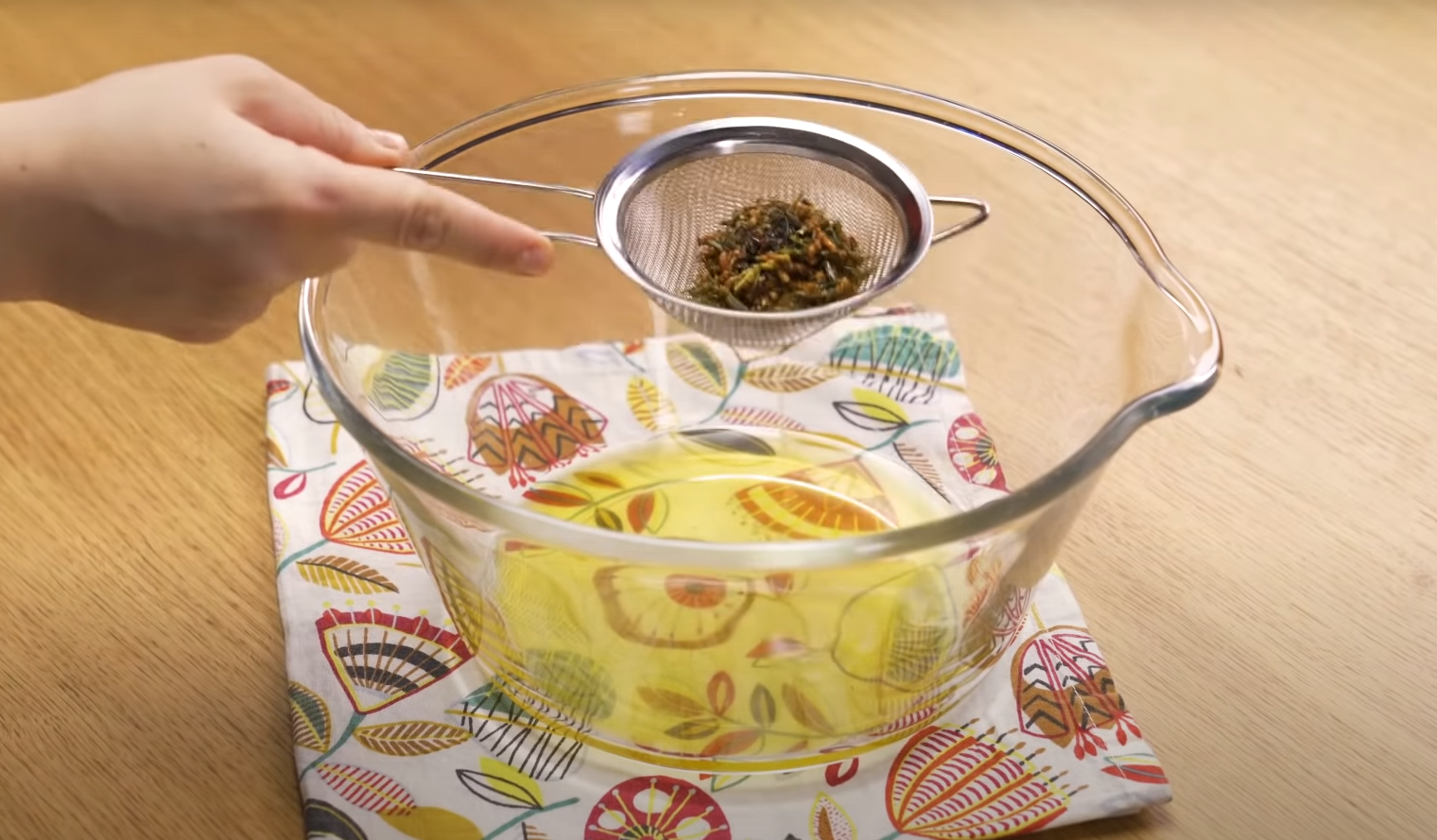 Drobno posiekaj rozmaryn i dodaj na patelnię z oliwą z oliwek. Wymieszaj z przeciśniętym przez praskę czosnkiem i podsmaż przez chwilę. Następnie przecedź olej przez sito, nie wyrzucaj rozmarynu, przyda się później.