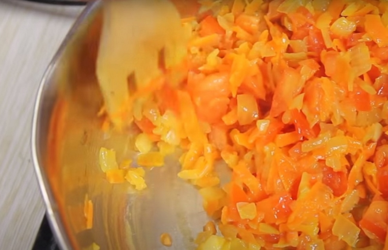 Zetrzyj marchewki na grubej tarce i pokrój cebulę w kostkę. Cebulę i marchewkę podsmaż w rondelku, w którym ugotujesz zupę z dodatkiem 3 łyżek oliwy. Gdy cebula będzie przezroczysta, dodaj pokrojone w kostkę pomidory i wymieszaj.