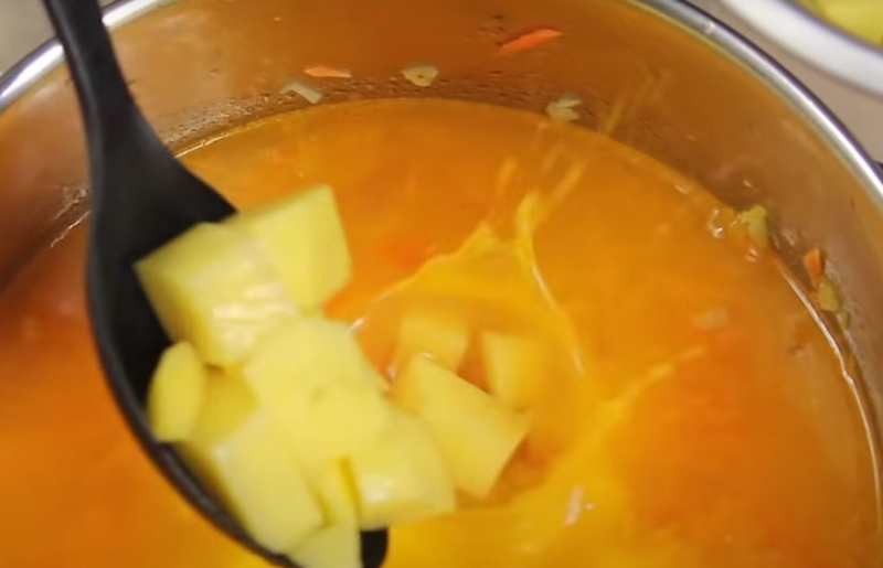 Wlej 1,5 litra czystej przefiltrowanej wody do garnka z warzywami. Następnie obierz ziemniaki i drobno posiekaj. Wsyp ziemniaki do rondla, zupę posól.