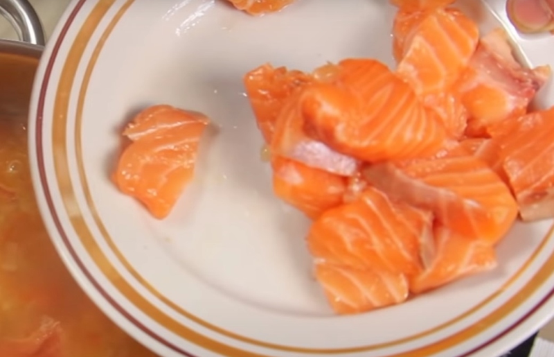 Duś przez 15 minut, a następnie włóż do garnka średniej wielkości, pokrojonego na kawałki łososia lub inną czerwoną rybę. Zagotuj zupę i dodaj suszone lub świeże posiekane zioła.